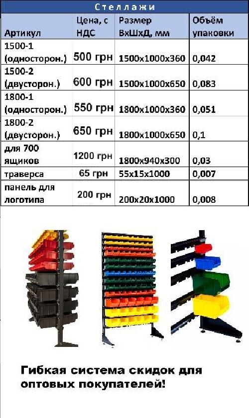 Стеллаж складской для метизов - удобное решение для складирования пластиковых ящиков для метизов. Прочная стальная конструкция складского стеллажа для метизов позволяет выдержать нагрузку до 300 кг. Складской стеллаж для метизов может изготавливаться разной высоты - 1500мм. и 1800 мм. Такие размеры стеллажа позволяют подобрать конструкцию удобную для людей разного роста. Стеллажи для пластиковых ящиков могут быть односторонними и, если позволяет площадь - двусторонними. Стойки складского стеллажа соединяются поперечными траверсами. Количество траверс зависит от размеров и количества ящиков заказанных клиентом. Сверху возможно размещение рекламной планки, на которую можно нанести логотип компании.